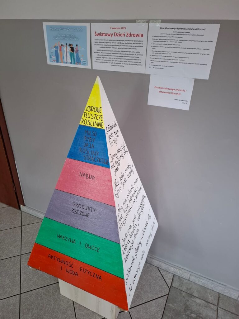W tym dniu aktywnie spędzaliśmy na sali gimnastycznej długie przerwy, a uczennica klasy 7a Wiktoria Ulatowska wykonała na tą okazję piramidę zdrowego żywienia i aktywności fizycznej.