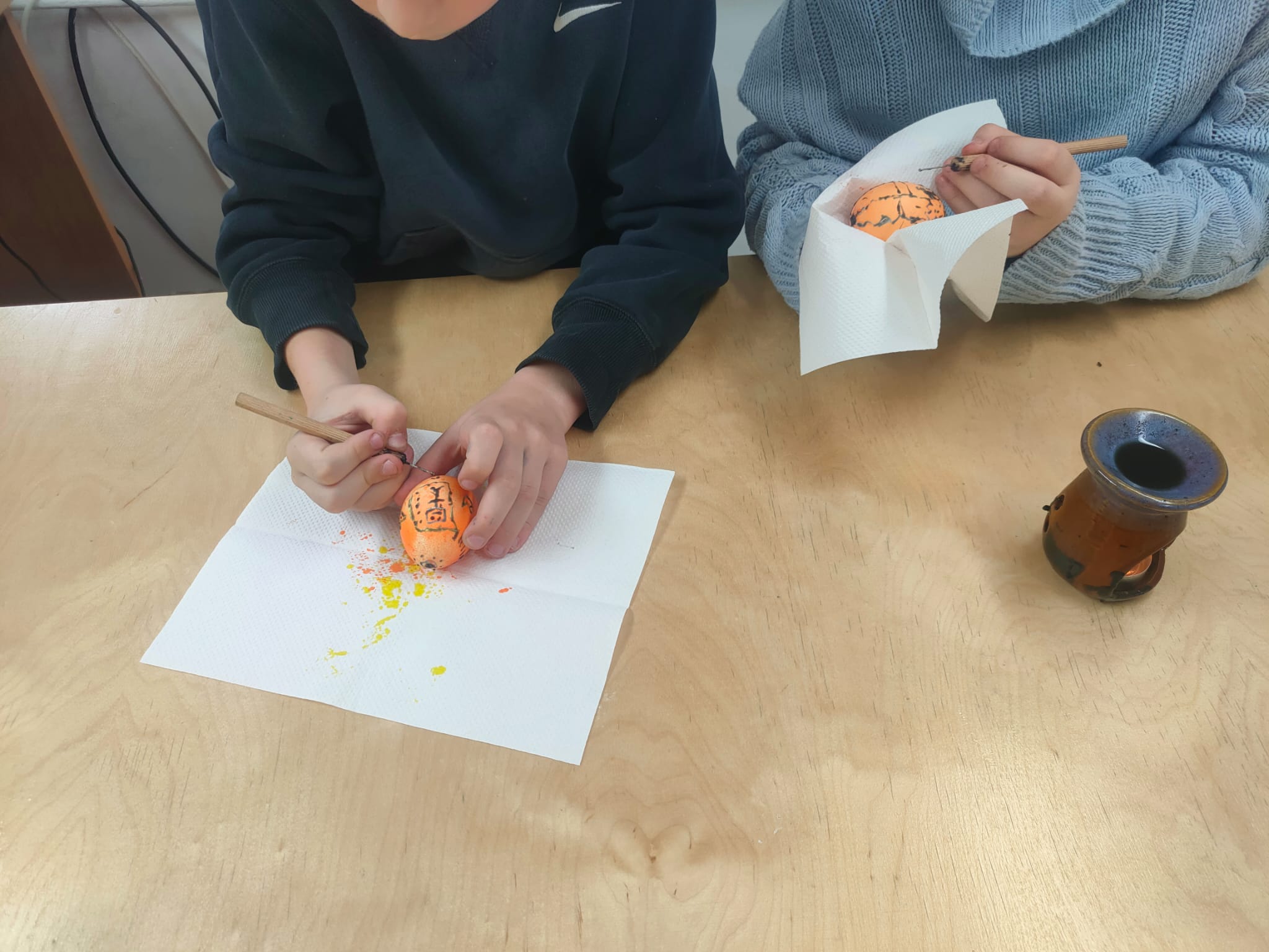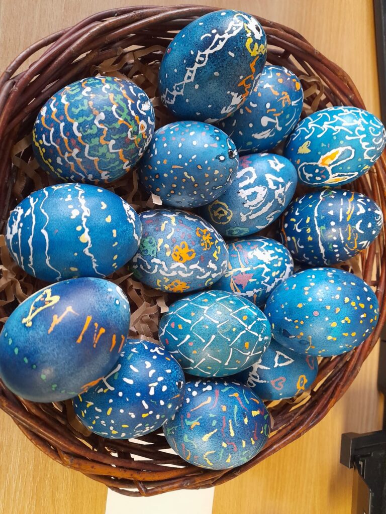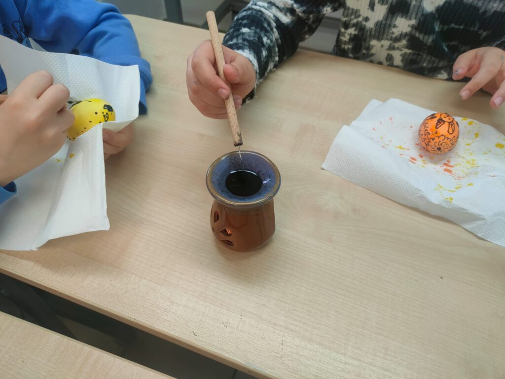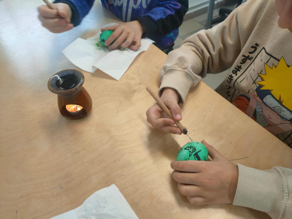 Podczas warsztatów plastyki obrzędowej, które odbyły się w naszej szkole 3 i 4 kwietnia, tworzyliśmy pisanki w technice batikowej. Warsztaty przeprowadził Piotr Rozumek nauczyciel naszej szkoły, w klasach 2a, 2b, 3a. Była to świetna okazja, żeby poznać tradycyjne metody zdobienia jajek, które mają głęboki wymiar obrzędowy i kulturowy. W trakcie warsztatów uczyliśmy się, jak za pomocą wosku i barwników tworzyć piękne, unikalne wzory na jajkach. To nie tylko była świetna zabawa, ale też sposób na poznanie bogatej tradycji i wyrażenie swojej kreatywności.