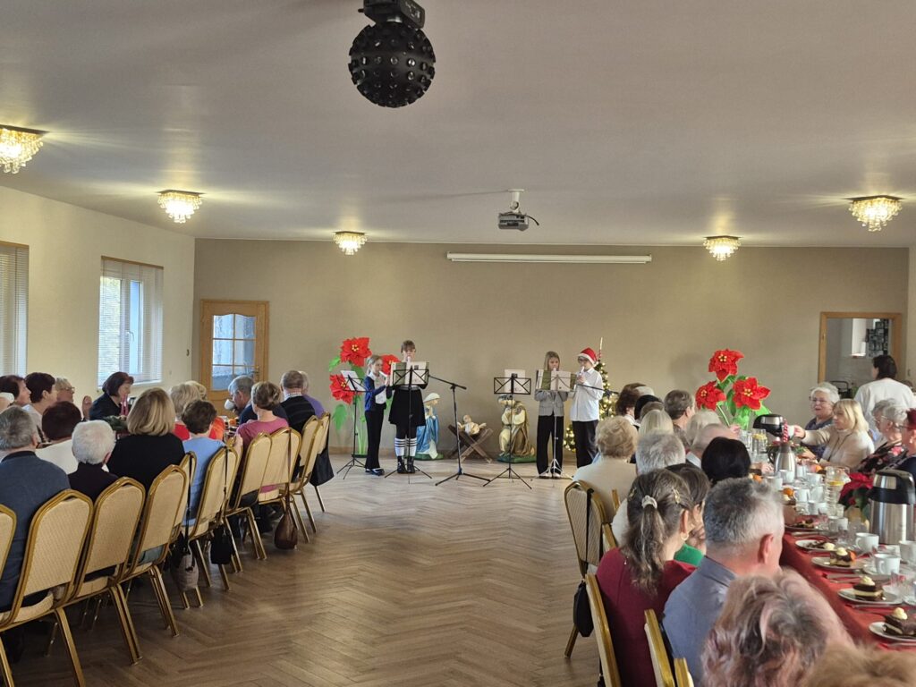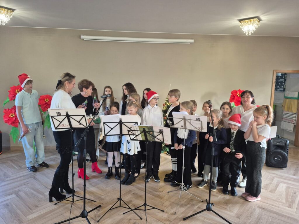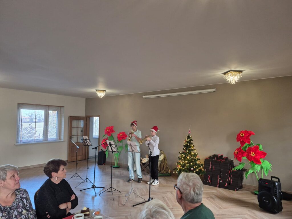 Wydarzenie to stało się pięknym pomostem łączącym pokolenia, przypominając nam wszystkim, jak istotna jest obecność młodych ludzi w życiu lokalnej społeczności. Program artystyczny został przygotowany z ogromną starannością, a każdy z występów wnosił do spotkania inną, wyjątkową energię. Najmłodsi artyści wprowadzili zebranych w bożonarodzeniowy nastrój, wykonując radosne pastorałki. Ich autentyczność i dziecięca radość wywołały uśmiechy na twarzach wszystkich gości .Uczniowie zaprezentowali swoje umiejętności muzyczne, grając tradycyjne kolędy na fletach. Delikatne brzmienie instrumentów idealnie wpisało się w kontemplacyjny charakter adwentowego oczekiwania. Maks i Igor dali popis mistrzowskiej gry na trąbkach. Doniosłe dźwięki instrumentów dętych podkreśliły uroczysty i podniosły charakter spotkania, wzbudzając prawdziwy podziw wśród seniorów.