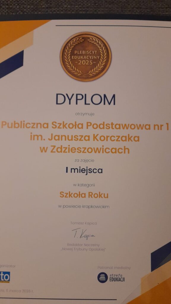 Szkoła Podstawowa nr 1 im. Janusza Korczaka w Zdzieszowicach od lat stawia na rozwój uczniów, nowoczesne metody nauczania oraz aktywne uczestnictwo w życiu lokalnej społeczności. Osiągnięcie w plebiscycie jest kolejnym potwierdzeniem, że działania podejmowane przez szkołę i jej nauczycieli są dostrzegane i doceniane przez mieszkańców regionu.