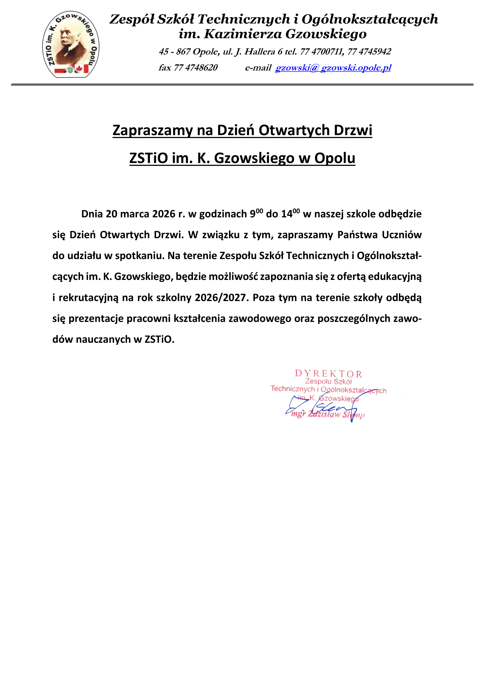 Zapraszamy na Dzień Otwartych DrzwiZSTiO im. K. Gzowskiego w Opolu