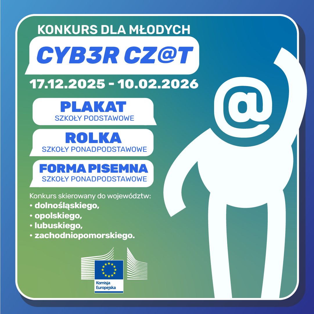 CYBER CZAT to element szerszych działań edukacyjnych Unii Europejskiej na rzecz wzmacniania kompetencji cyfrowych, higieny cyfrowej oraz bezpieczeństwa dzieci i młodzieży w sieci, realizowanych m.in. w ramach strategii BIK+ – Lepszy Internet dla Dzieci.Więcej informacji: https://poland.representation.ec.europa.eu/events/konkurs-cyber-czat-2026-2025-12-17_pl Konkurs ma charakter kreatywny, uczniowie mogą zgłaszać prace w następujących formach: plakat (szkoły podstawowe).…