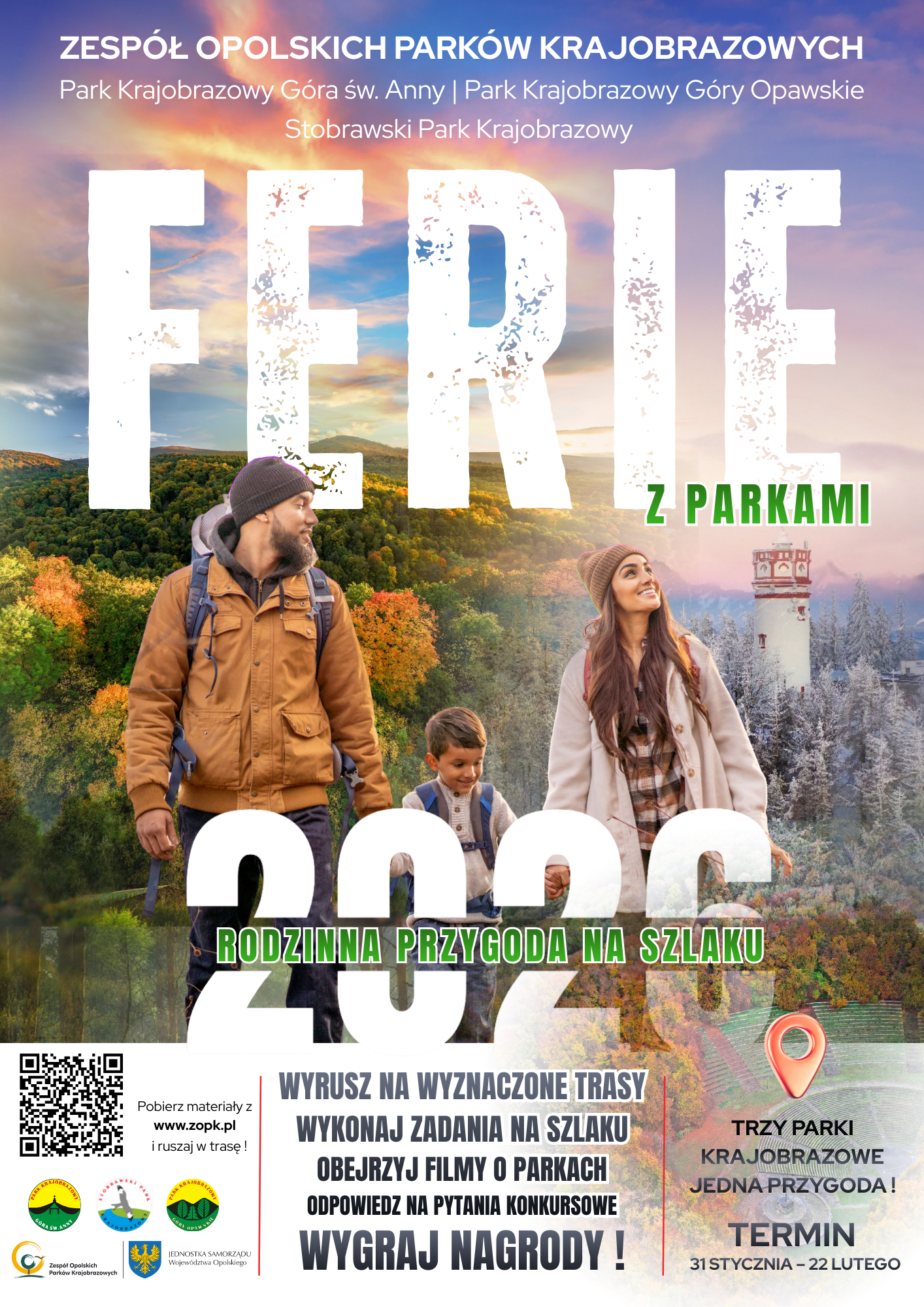 W okresie 31 stycznia – 22 lutego zapraszamy do udziału w konkursie „Ferie z parkami”, skierowanym do wszystkich miłośników pieszych wędrówek – dzieci, młodzieży, rodzin z dziećmi oraz dorosłych. Konkurs ma charakter otwarty – udział może wziąć każdy, kto jest zainteresowany aktywnym spędzeniem ferii. Więcej informacji na stronie https://zopk.pl/ferie-z-parkami-rodzinny-konkurs-dla-milosnikow-pieszych-wedrowek/