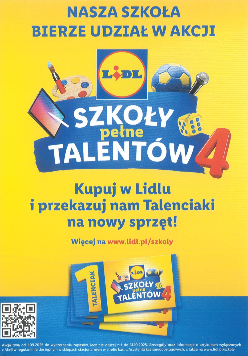 Szanowni Rodzice, Uczniowie, Nauczyciele, nasza szkoła po raz kolejny bierze udział w akcji „SZKOŁY pełne TALENTÓW” organizowanej przez sieć sklepów Lidl. Możecie pomóc nam zbierać Talenciaki, które są wydawane od 1 września 2025 do 31 października 2025 lub do wyczerpania zapasów we wszystkich sklepach stacjonarnych Lidl za każde wydane 50…