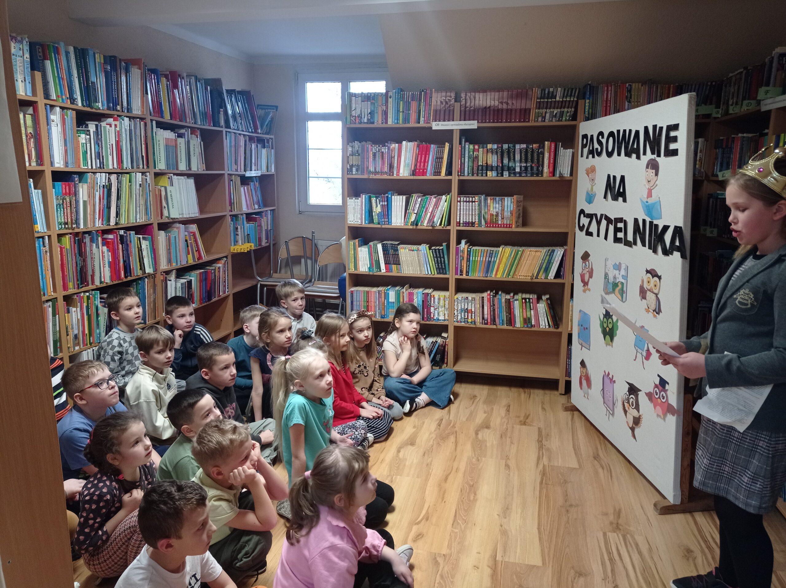 28 lutego w szkolnej bibliotece odbyło się pasowanie uczniów klasy pierwszej na czytelników. Po powitaniu, wysłuchaniu wiersza o książce i jej próśb, przedstawionych przez Królową Książek, w którą wcieliła się nasza najlepsza czytelniczka – Ola, nadszedł czas na ….. zagadki. Dzieci odpowiadały na pytania dotyczące bohaterów bajek i świetnie sobie…
