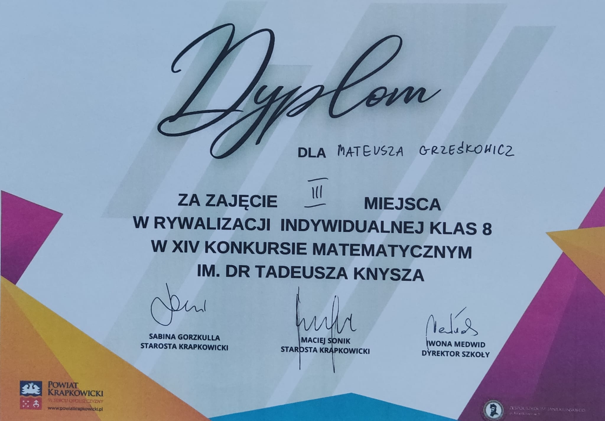 Drugiego czerwca odbył się XIV Krapkowicki Konkurs Matematyczny im. dr T. Knysza dla uczniów klas VII i VIII szkoły podstawowej. Organizatorem był Zespół Szkół im. Jana Kilińskiego w Krapkowicach.Nasz uczeń Mateusz Grześkowicz zdobył III miejsce w rywalizacji indywidualnej klas VIII.Serdecznie gratulujemy!